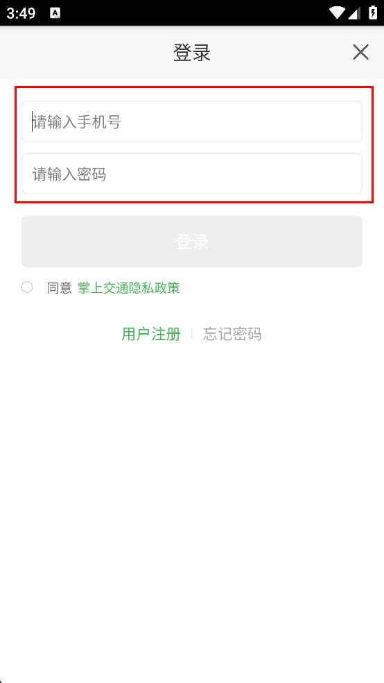 4、在登錄頁面,分別在“請輸入手機(jī)號”和“請輸入密碼”輸入框中輸入手機(jī)號和密碼,勾選“同意 掌上交通隱私政策”,然后點擊“登錄”按鈕,完成賬號登錄操作。