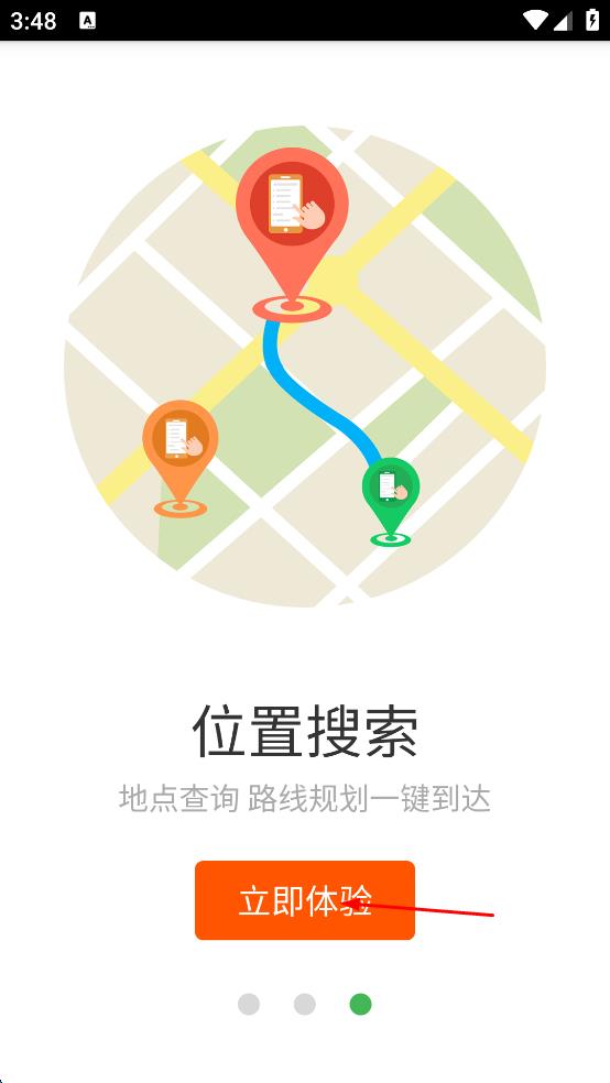 1、打開掌上交通軟件,看到“位置搜索 地點查詢 路線規(guī)劃一鍵到達(dá)”的宣傳界面,點擊“立即體驗”按鈕,進(jìn)入軟件主界面。