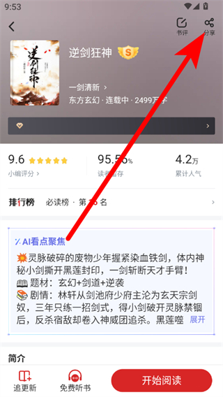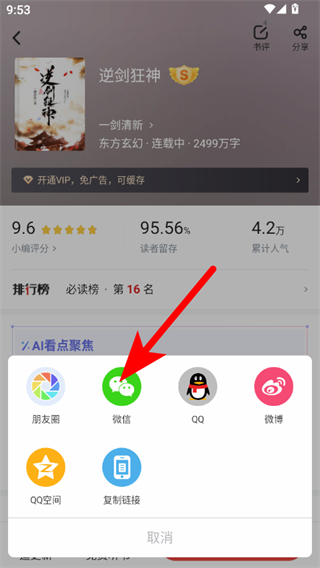 2、在小說(shuō)詳情頁(yè)面,點(diǎn)擊右上角分享選項(xiàng),展開分享方式列表。