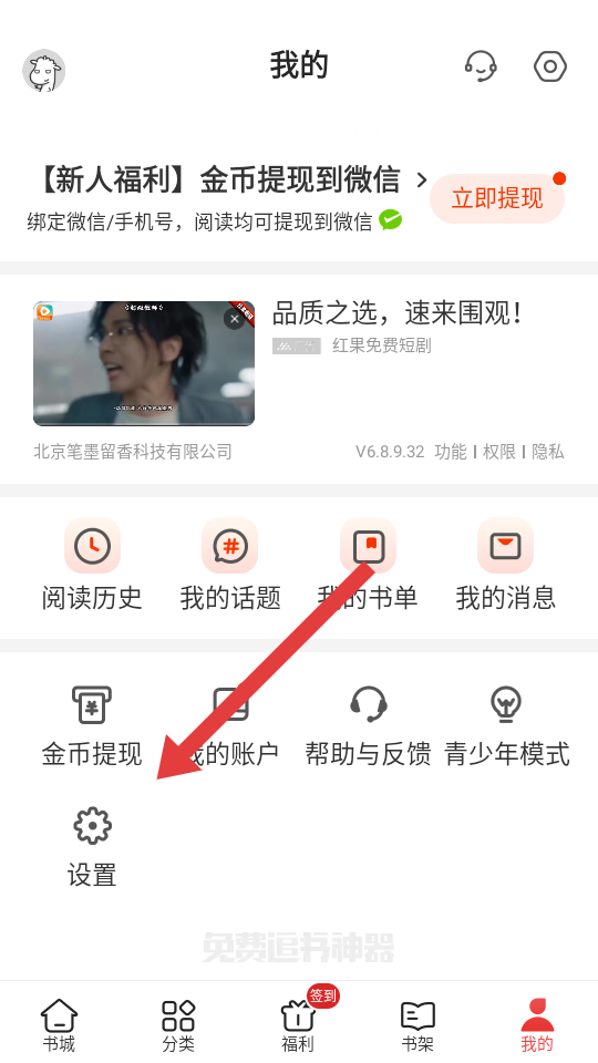 1、在追書神器我的頁面,點(diǎn)擊設(shè)置的圖標(biāo),進(jìn)入設(shè)置的界面。