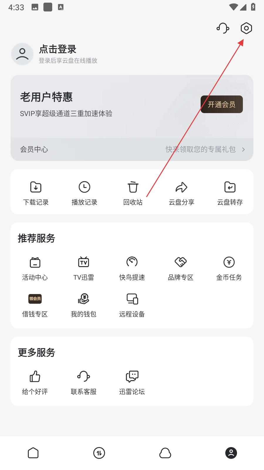 1、打開(kāi)迅雷APP,點(diǎn)擊界面右下角我的,再點(diǎn)擊右上角的六邊形設(shè)置圖標(biāo),進(jìn)入設(shè)置頁(yè)面。