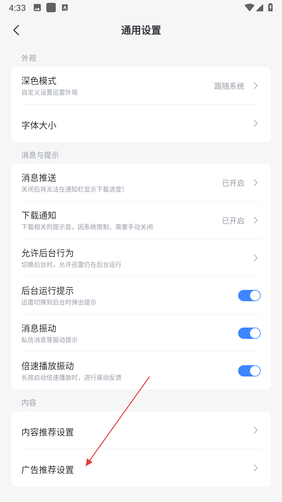 3、在通用設(shè)置界面里,點(diǎn)擊廣告推薦設(shè)置選項(xiàng),進(jìn)入廣告推薦設(shè)置頁(yè)面。