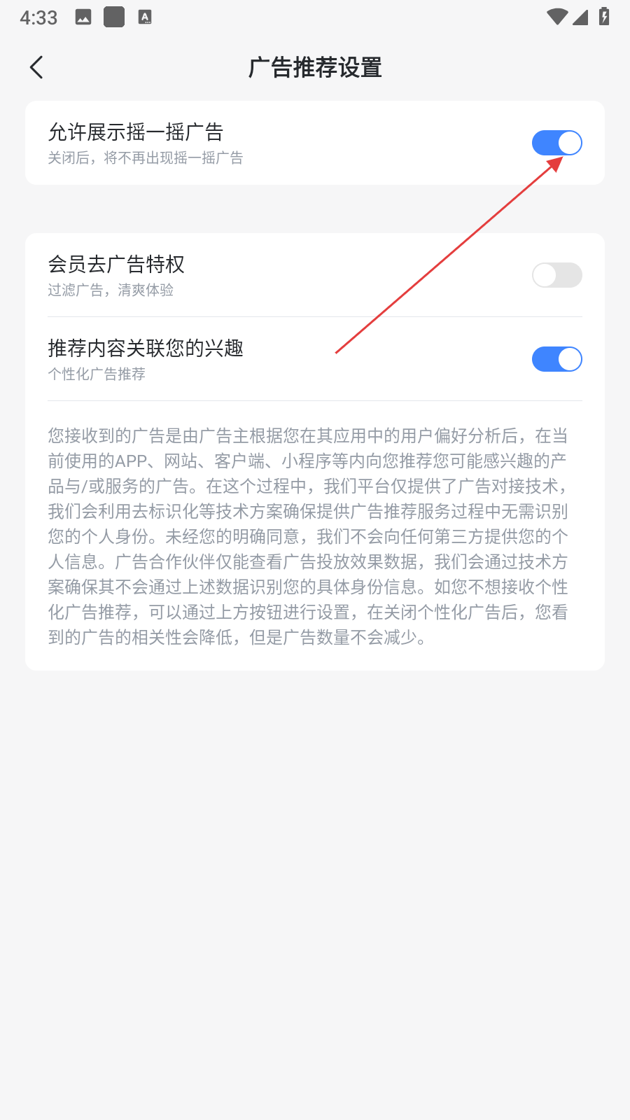 4、在廣告推薦設(shè)置頁(yè)面,找到允許展示搖一搖廣告的開(kāi)關(guān)按鈕,點(diǎn)擊將其關(guān)閉。