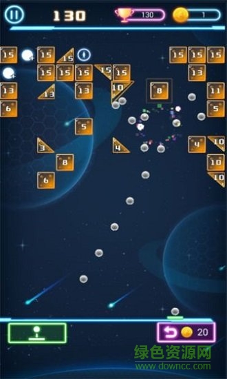1、玩家根據(jù)小球初始彈射角度來進行小球發(fā)射,來消除各種塊狀物;