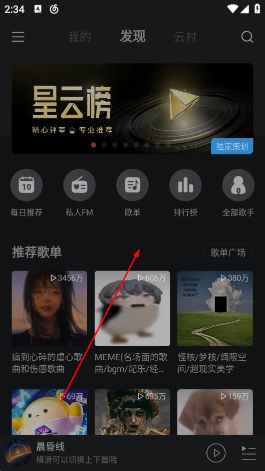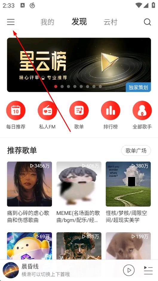 1、打開網(wǎng)易云音樂極速版應用,點擊左上角的三條橫線圖標,打開側邊欄菜單。