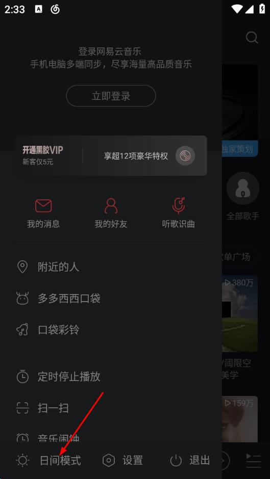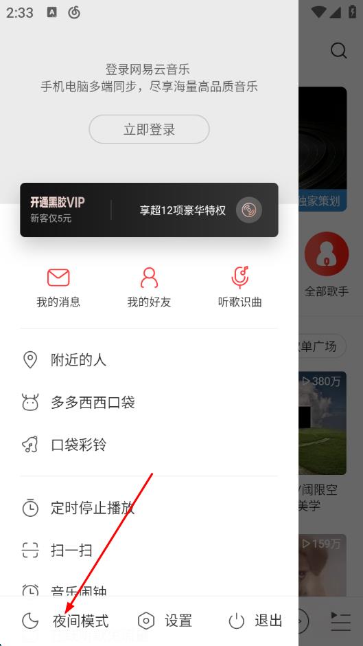 2、在側邊欄菜單中,找到并點擊夜間模式選項。