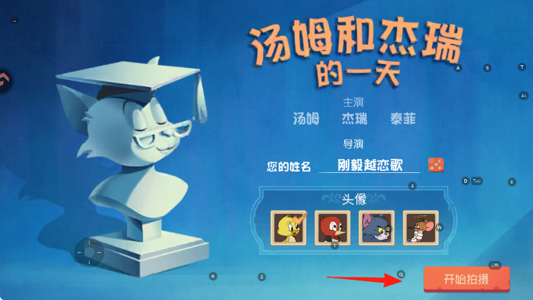 1、標(biāo)題湯姆和杰瑞的一天,主演湯姆、杰瑞、泰菲,有姓名剛毅超戀歌,頭像選擇及開始拍攝按鈕。