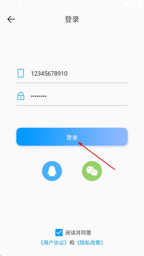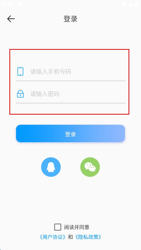 2、進(jìn)入登錄頁(yè)面,輸入手機(jī)號(hào)碼和密碼。