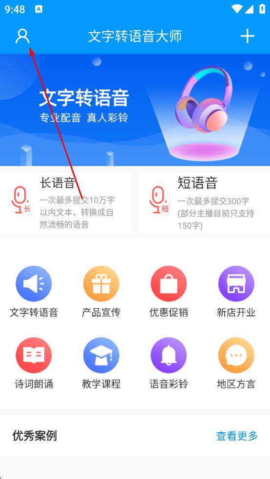 1、打開(kāi)文字轉(zhuǎn)語(yǔ)音大師首頁(yè),點(diǎn)擊左上角人形圖標(biāo)。