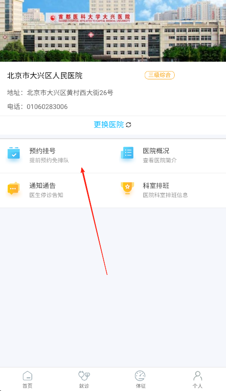 2、切換到底部導(dǎo)航就診頁面,選定北京市大興區(qū)人民醫(yī)院后,點(diǎn)擊預(yù)約掛號功能,依據(jù)指引確認(rèn)就診信息,提交預(yù)約申請,還可查看醫(yī)院概況了解機(jī)構(gòu)詳情。