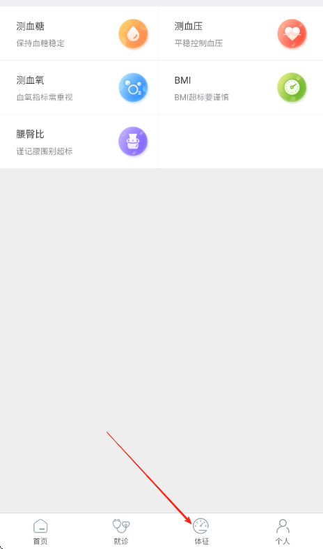 3、進(jìn)入體征頁面,按需選擇測血糖測血壓等檢測功能,按照APP提示準(zhǔn)備檢測工具,規(guī)范操作采集數(shù)據(jù),完成后可查看檢測結(jié)果,輔助健康管理。
