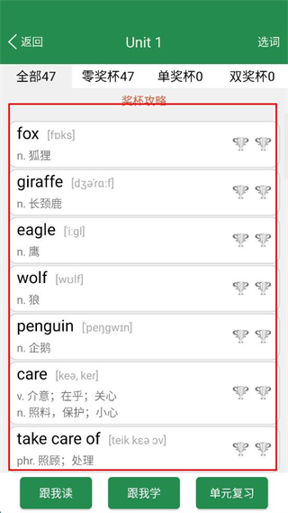 4、進(jìn)入Unit1單詞界面,可查看fox、giraffe等單詞的音標(biāo)和釋義。