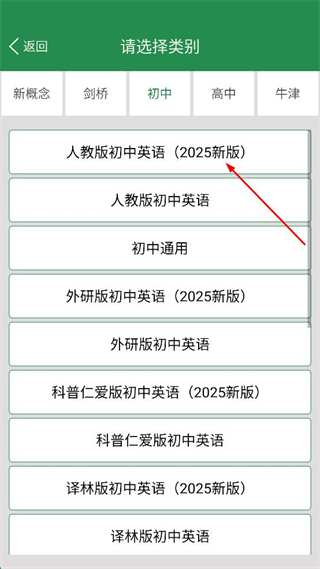 1、在請選擇類別界面點(diǎn)擊人教版初中英語選項。