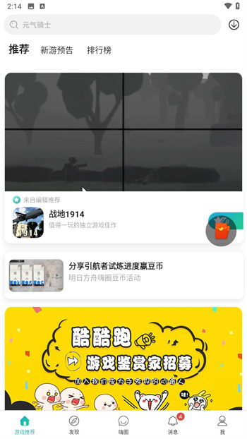 1、打開酷酷跑app后,在首頁可以看到最上面的【推薦】,編輯會每日推薦精品好玩的游戲給用戶;