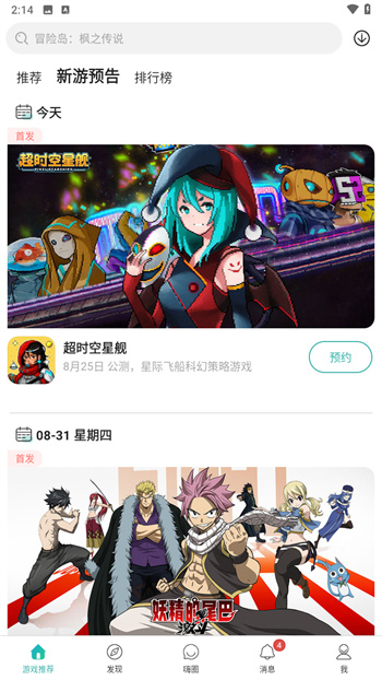 2、在推薦旁邊是新游預告,會將每天首發(fā)的游戲以及各種即將上線的游戲更新在這個頁面,能夠及時通過這里發(fā)現(xiàn)新游戲;