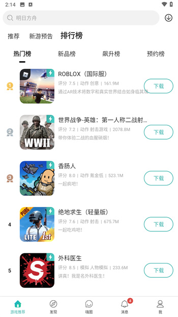 3、新游預告的旁邊是排行榜,排行榜包含了熱門榜、新品榜、飆升榜、預約榜等,分別滿足不同玩家的喜好需求,輕松從榜單中找到自己想要體驗的游戲;