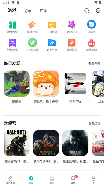 4、通過【發(fā)現(xiàn)】頻道可以根據廠商、分類等不同的頻道發(fā)現(xiàn)新游戲,另外還有玩家分享、steam移植、精品漢化、國際服、最新測試、離線游戲、主播熱游等不同的頻道;