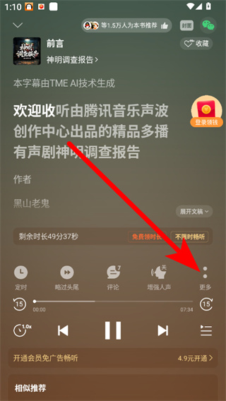 3、在聽書播放界面,點擊更多選項,展開功能菜單。