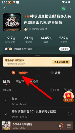 2、在聽書詳情頁面,點擊開始播放按鈕,進(jìn)入聽書播放界面。