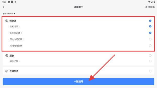 2、選擇清除內(nèi)容:在清理助手頁面,可勾選瀏覽器記錄,含搜索、標簽、歷史訪問等、播放記錄、傳輸列表等選項,按需選擇要清除的記錄類型。