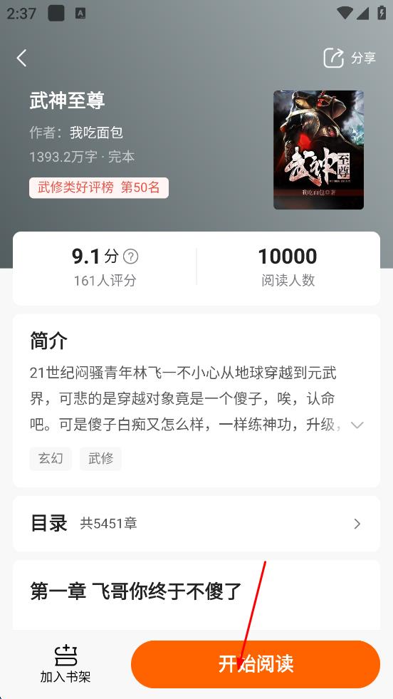 4、在小說詳情頁面,點擊“開始閱讀”按鈕,即可開始閱讀該小說。