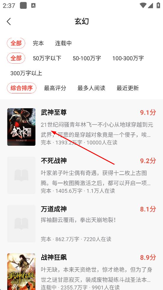 3、在玄幻小說列表頁面,瀏覽小說列表,找到想要閱讀的小說,比如“武神至尊”,點擊該小說,進入小說詳情頁面。