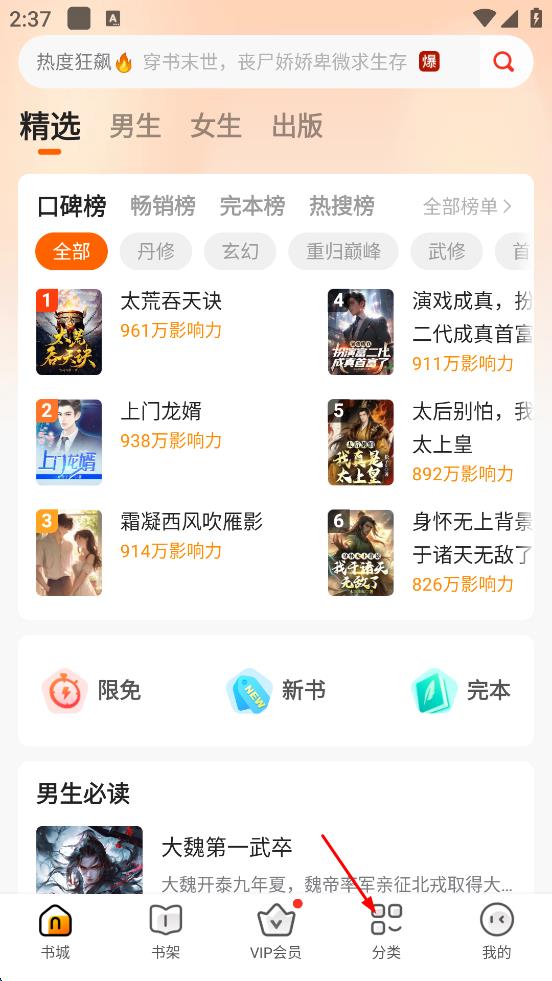 1、打開小說閱讀軟件,進入書城頁面,點擊頁面下方的“分類”選項,進入分類頁面。