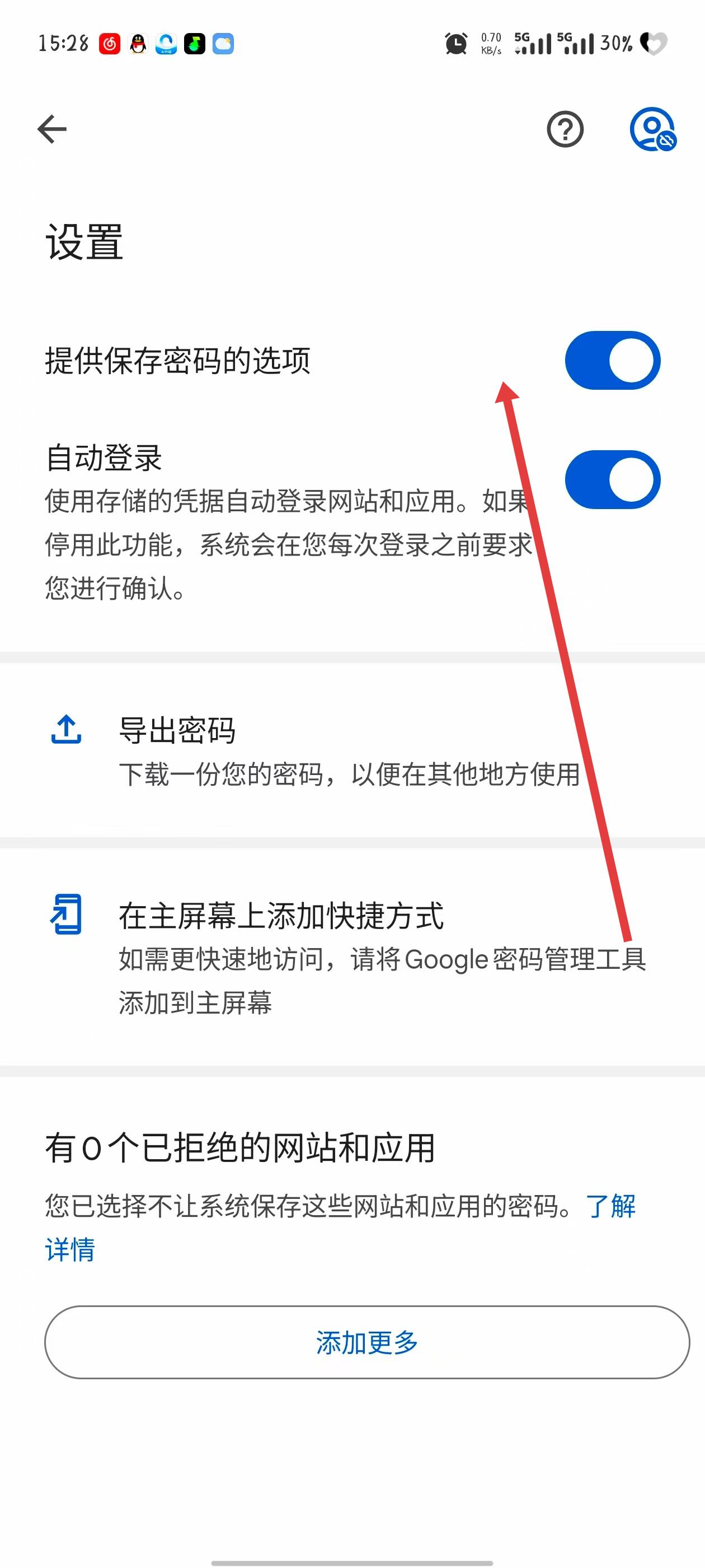 3、在設置里,開啟提供保存密碼的選項開關(guān)。
