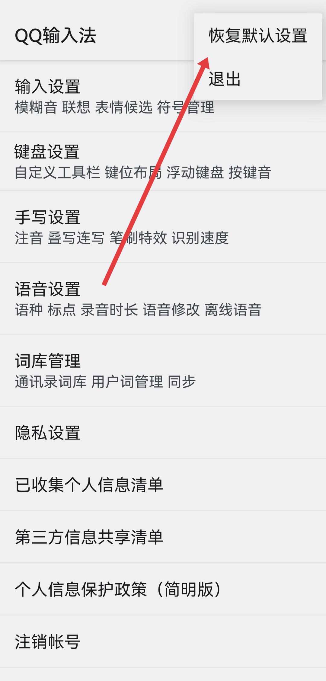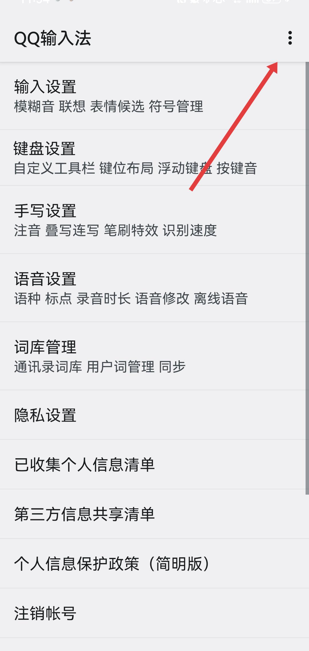 1、進(jìn)入QQ輸入法設(shè)置頁面,點擊頁面右上角垂直三點形狀的更多圖標(biāo),展開功能菜單。