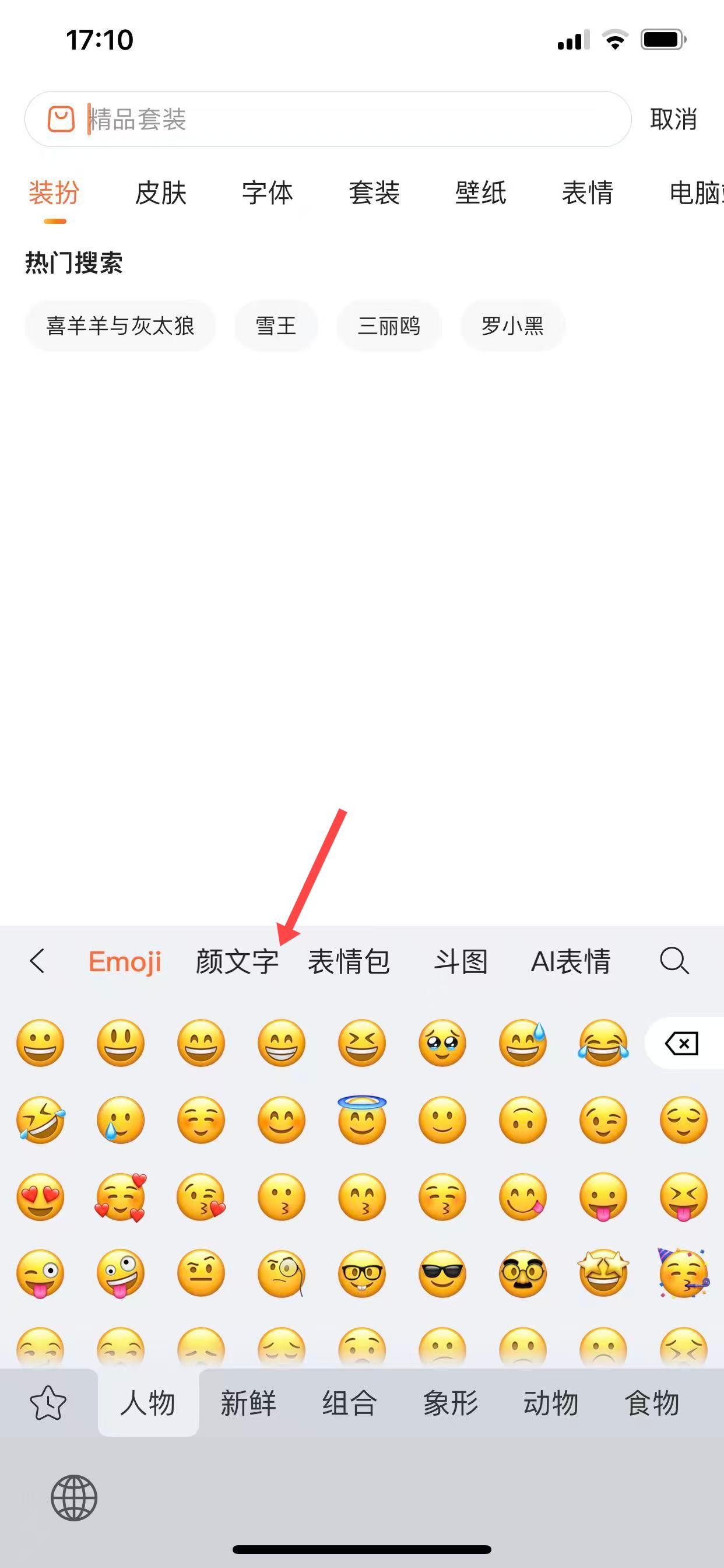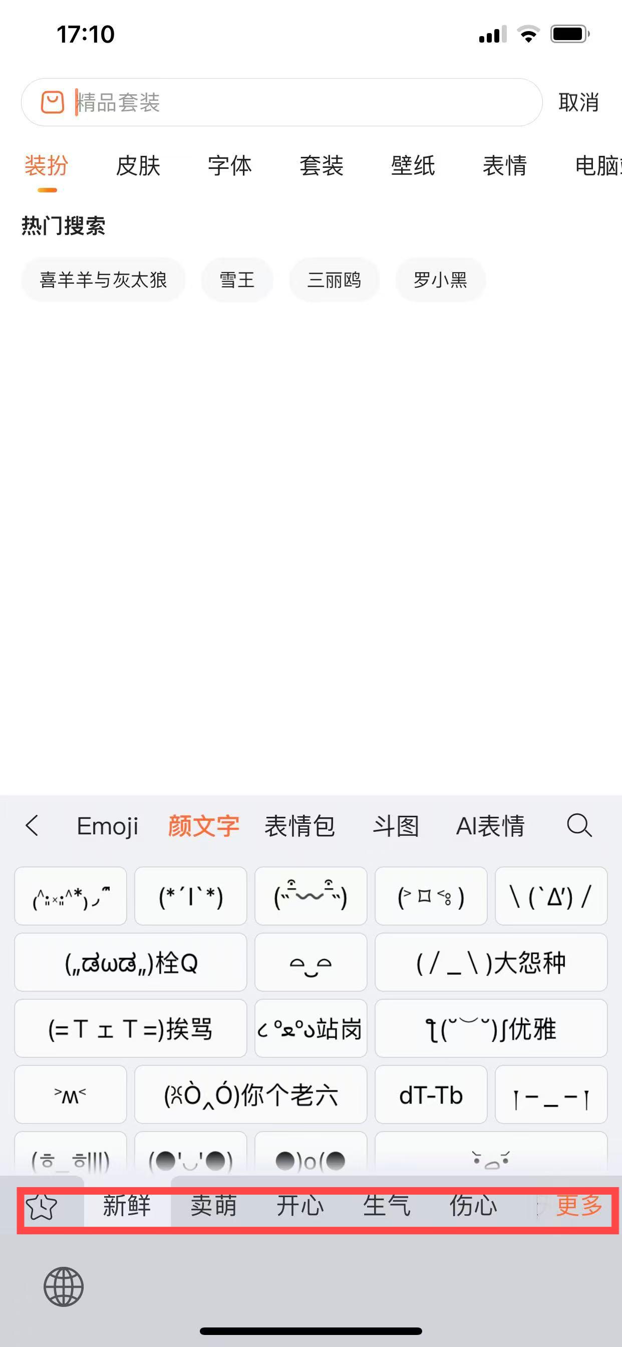 3、在顏文字界面,可通過下方賣萌、開心等分類標簽篩選,找到想要的顏文字符號。