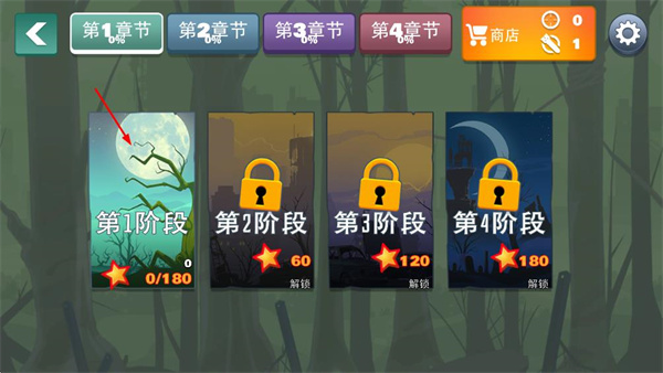 2、在章節(jié)選擇頁面,點擊第1階段選項,進入對應(yīng)的僵尸射擊關(guān)卡場景。