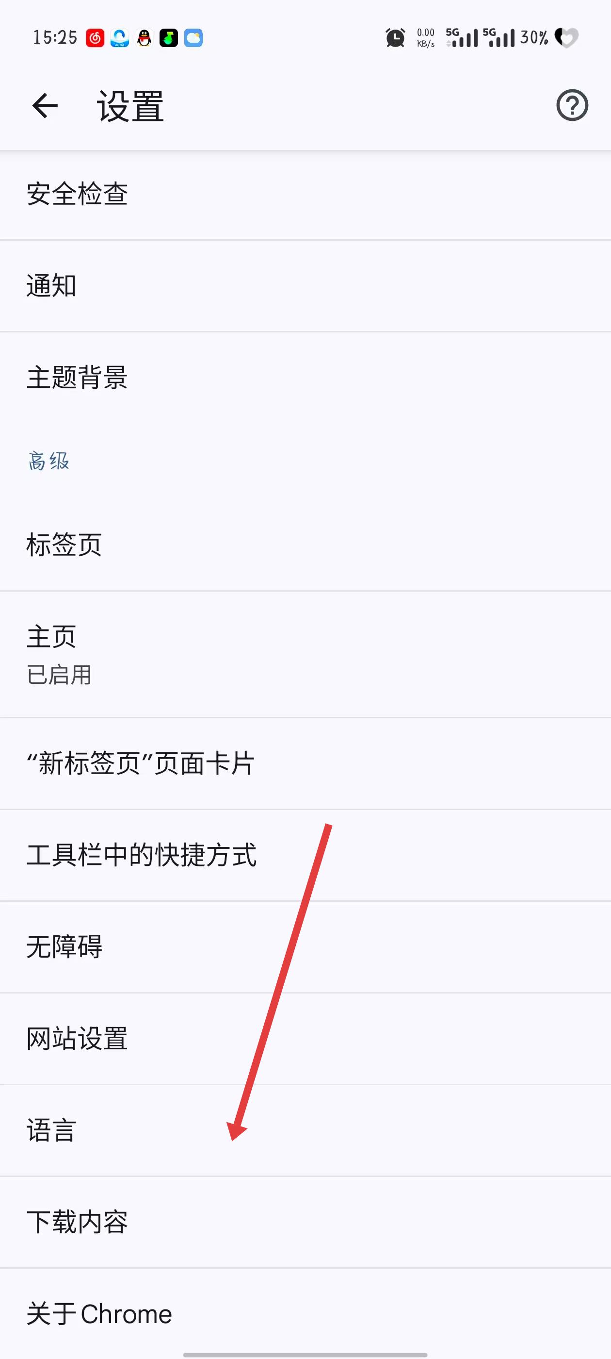 3、在設(shè)置頁面中進(jìn)行下滑,找到并點(diǎn)擊語言選項(xiàng)。