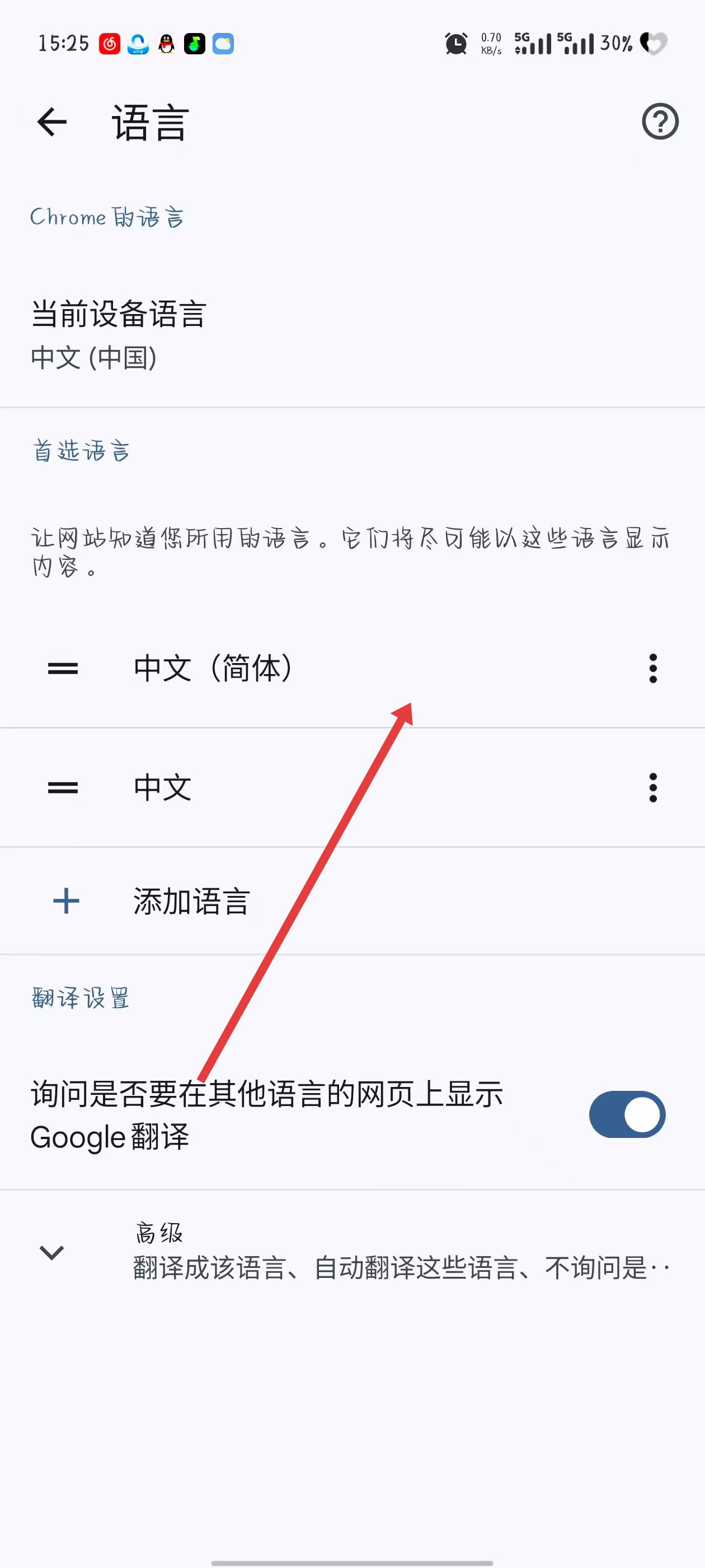 4、在語言頁面,點(diǎn)擊中文右側(cè)的三點(diǎn)圖標(biāo),將其設(shè)為瀏覽器主要顯示語言。