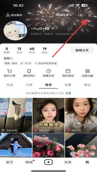 1、進入抖音個人主頁,點擊底部我,然后點擊右上角的三條橫線圖標。