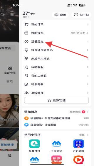 2、在彈出的側(cè)邊菜單中,用戶需點擊觀看歷史的選項。
