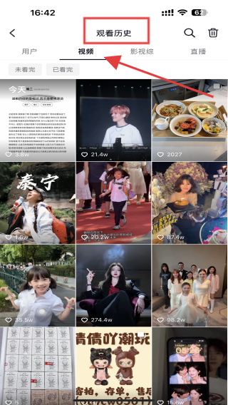 3、進入觀看歷史頁面后,默認顯示視頻標簽頁,即可看到所有看過的視頻記錄。