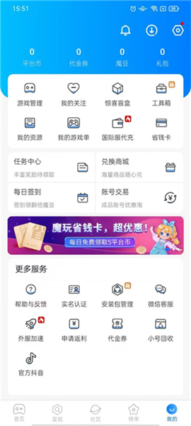 5、最后在我的板塊中,支持玩家進(jìn)行每日簽到、游戲代充、游戲加速等各種操作;