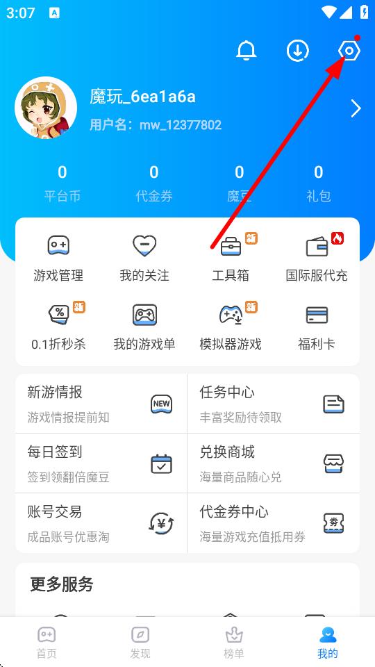 1、打開魔玩助手APP,點(diǎn)擊底部導(dǎo)航欄我的進(jìn)入個(gè)人頁面,點(diǎn)擊右上角設(shè)置圖標(biāo)。