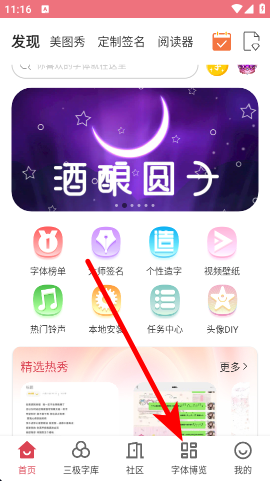 1、打開字體美化大師app,點(diǎn)擊底部導(dǎo)航欄中的字體博覽選項(xiàng)。