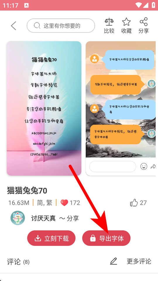 3、找到想要導(dǎo)出的字體,比如貓貓兔兔70,點(diǎn)擊該字體的展示框進(jìn)入詳情頁(yè)。