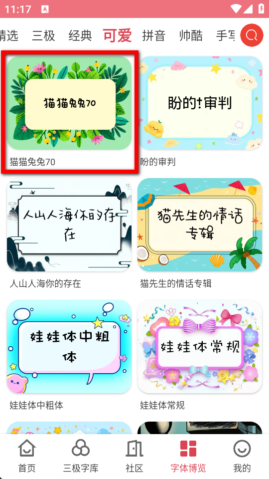 2、在字體博覽界面,上方有不同分類標(biāo)簽,點(diǎn)擊如可愛(ài)等分類查找想要導(dǎo)出的字體。