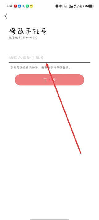 3、輸入新的手機(jī)號碼,點(diǎn)擊下一步,進(jìn)入輸入驗(yàn)證碼頁面。