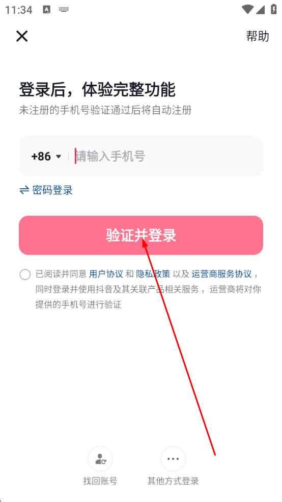 3、完成授權(quán)后,回到抖音登錄頁,輸入手機號碼,勾選同意協(xié)議,點擊驗證并登錄,完成賬號登錄流程 。