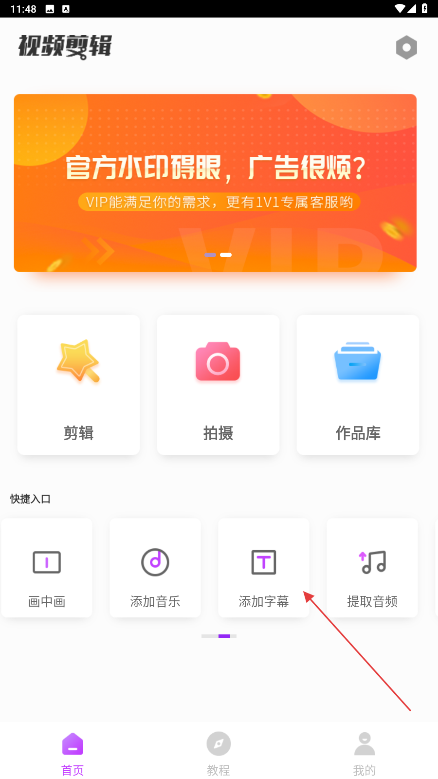 1、啟動(dòng)視頻剪輯大師APP,在首頁內(nèi)點(diǎn)擊添加字幕的按鈕。