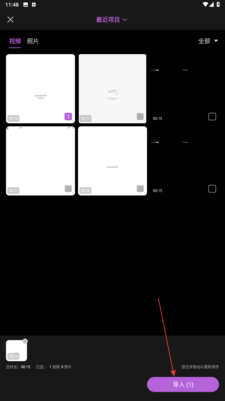 2、進(jìn)入視頻選擇的頁面內(nèi),選擇并點(diǎn)擊導(dǎo)入的按鈕。