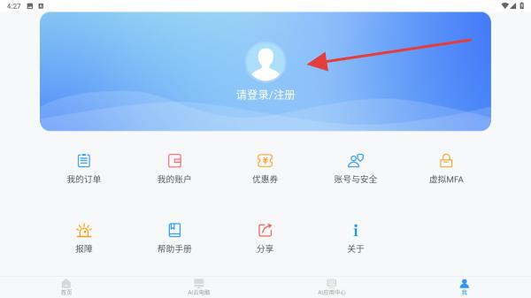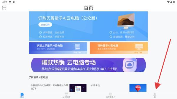 1、打開(kāi)天翼云電腦APP,點(diǎn)擊底部導(dǎo)航欄我,進(jìn)入個(gè)人中心頁(yè)面。