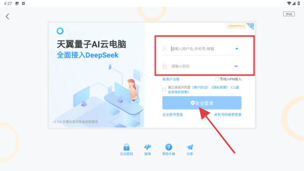 3、輸入已綁定手機(jī)/郵箱的賬號(hào)及密碼,勾選用戶協(xié)議后,點(diǎn)擊安全登錄即可。