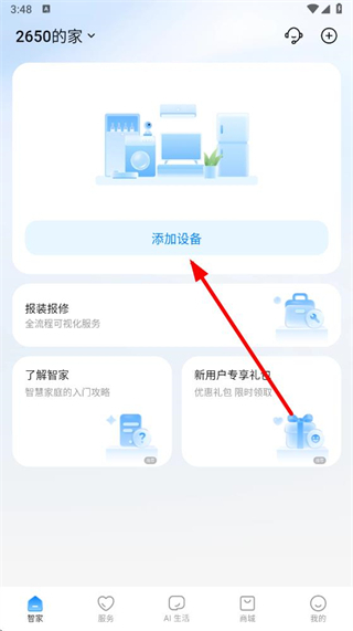 1、在海爾智家app智家頁(yè)面點(diǎn)擊添加設(shè)備選項(xiàng),進(jìn)入添加設(shè)備頁(yè)面。