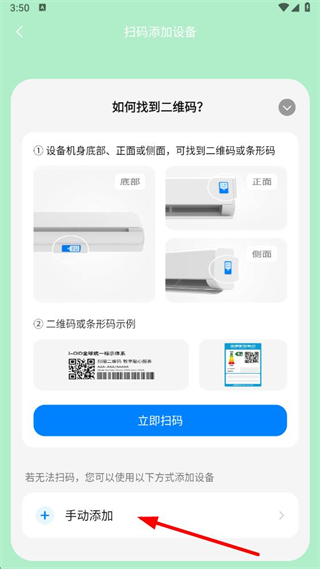 3、在掃碼添加設(shè)備頁(yè)面點(diǎn)擊手動(dòng)添加選項(xiàng),進(jìn)入手動(dòng)添加設(shè)備流程。