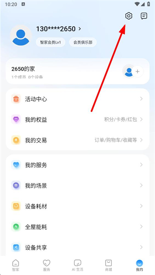1、打開(kāi)海爾智家APP,在我的頁(yè)面,點(diǎn)擊右上角設(shè)置圖標(biāo)。